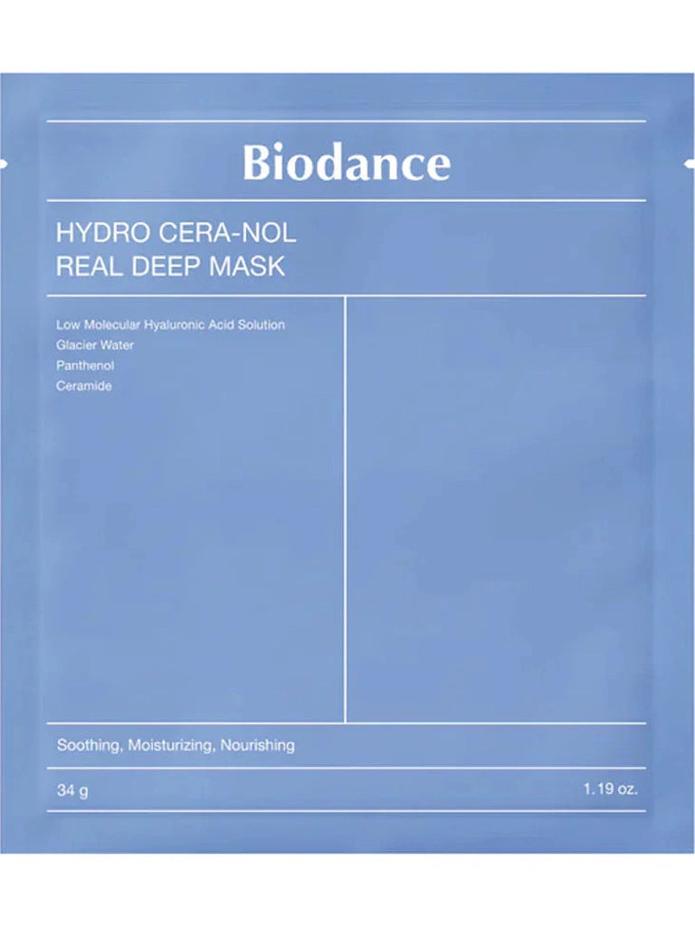 The Biodance Hydro Cera-Nol Real Deep Mask contains a bottle of highly-concentrated ampoule that has been solidified to keep skin soothed, cooled, nourished and glass-like smooth. Formulated with 50,000ppm of Glacial Water, Hyaluronic Acid, Ceramides and Panthenol to prevent water loss while plumping and nourishing for long-lasting hydration and glowing skin. The highly-concentrated ampoule is not soaked into the sheet, but hardened as a hydrogel mask pack, and as the skin effectively absorbs the active ingredients, it will look more transparent!