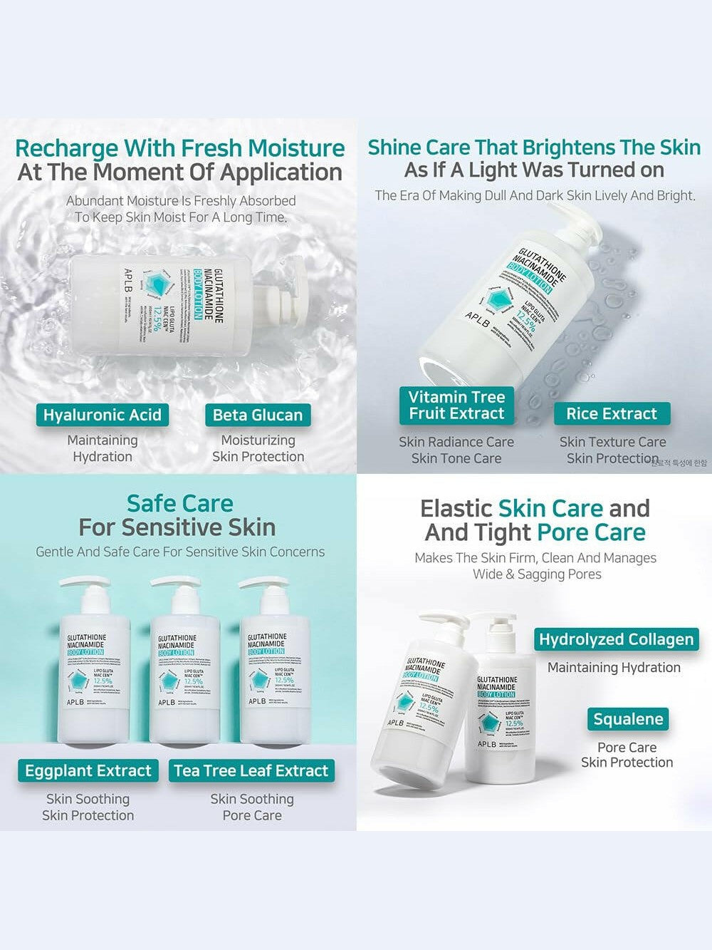 APLB Glutathione Niacinamide Body Lotion features the patented LIPO GLUTA NIAC CEN 12.5% complex, combining Niacinamide, Glutathione, and Centella Asiatica Extract for deep hydration and soothing relief for irritated skin.