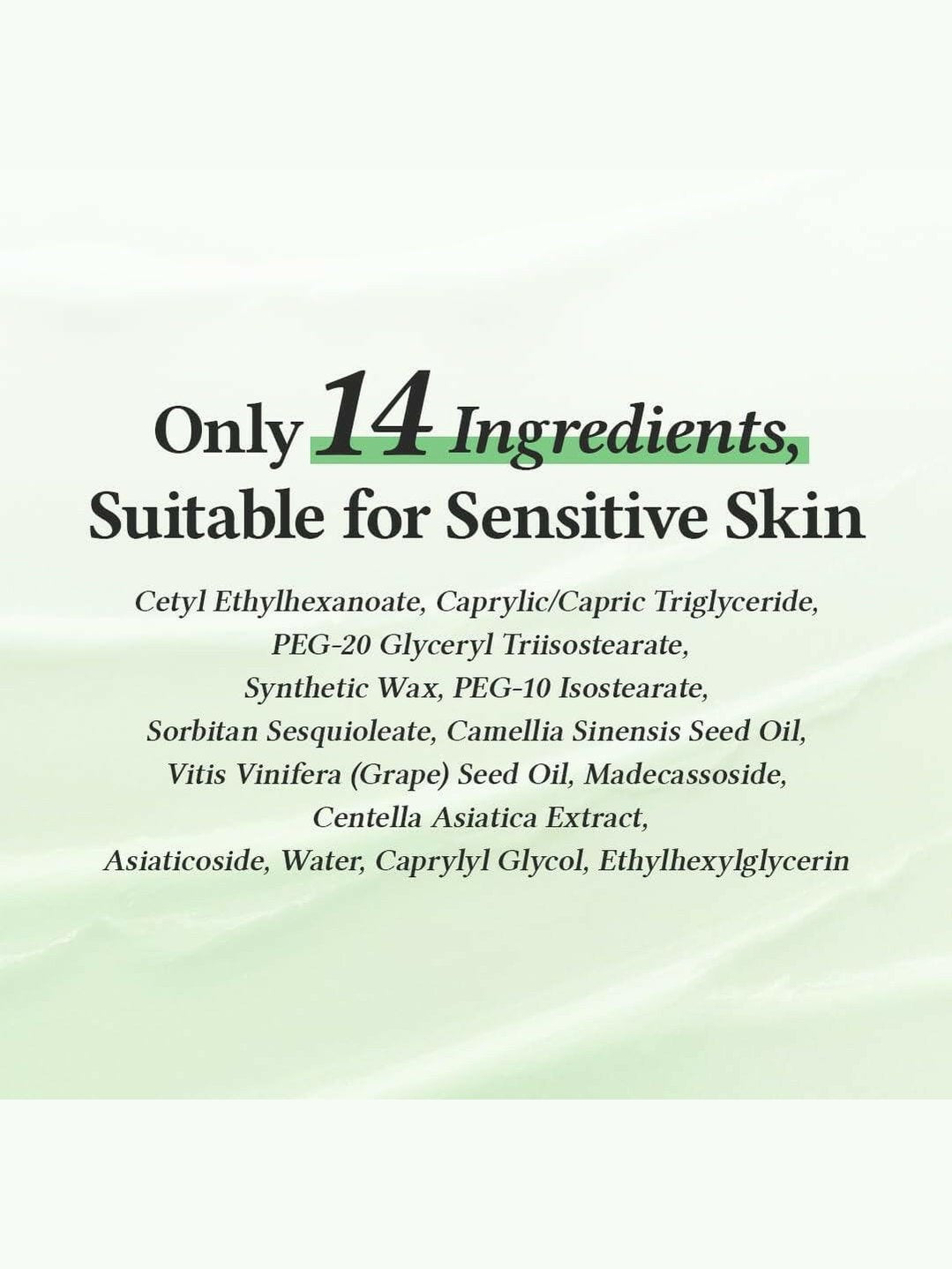 Cetyl Ethylhexanoate, Caprylic/Capric Triglyceride, PEG-20 Glyceryl Triisostearate, Synthetic Wax, PEG-10 Isostearate, Sorbitan Sesquioleate, Camellia Sinensis Seed Oil, Vitis Vinifera (Grape) Seed Oil, Madecassoside, Centella Asiatica Extract, Asiaticoside, Water, Caprylyl Glycol, Ethylhexylglycerin