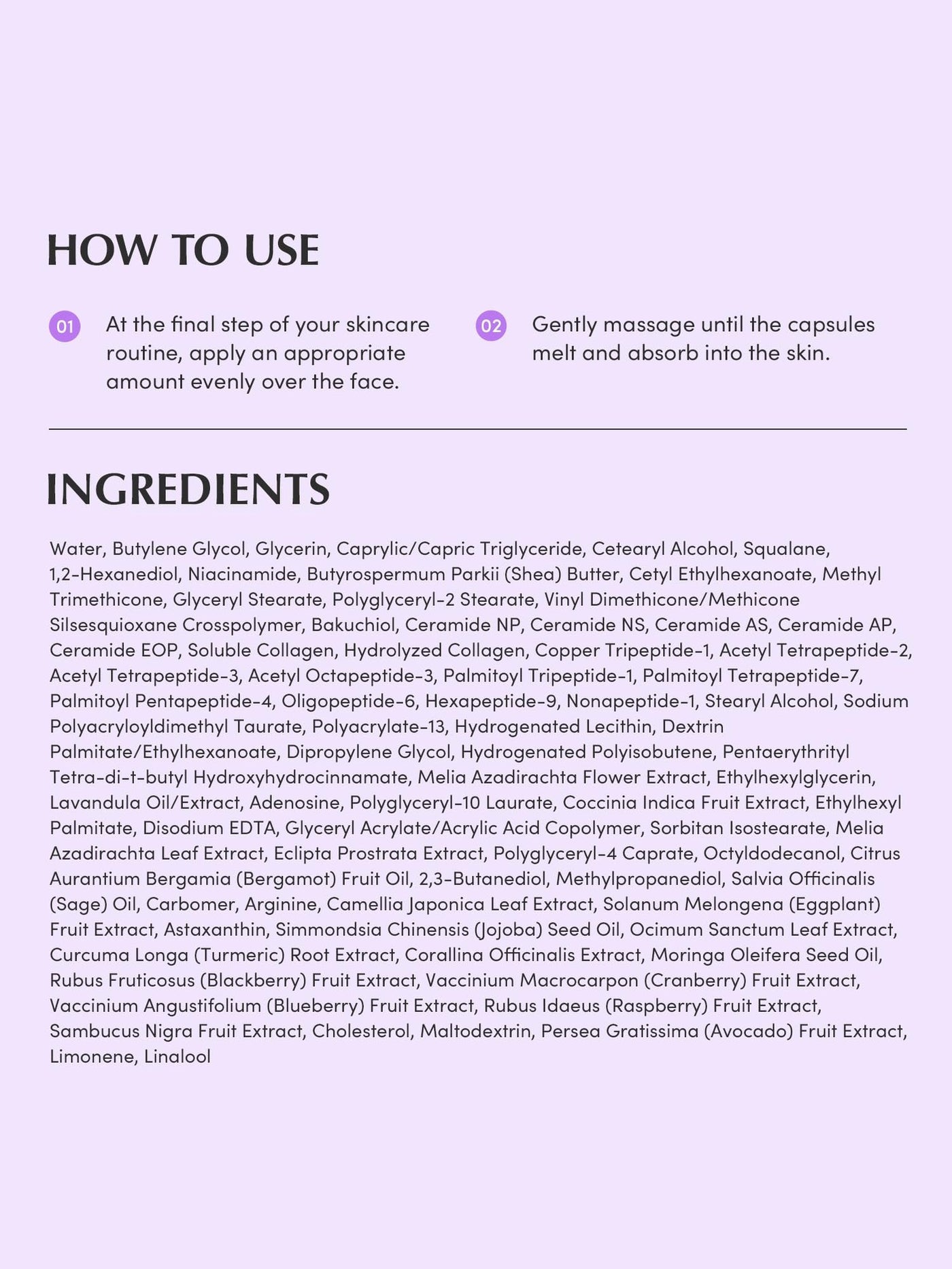 Aqua/Water/Eau, Glycerin, Caprylic/Capric Triglyceride, Cetearyl Alcohol, Squalane, 1,2-Hexanediol, Niacinamide, Butyrospermum Parkii (Shea) Butter, Cetyl Ethylhexanoate, Methyl Trimethicone, Glyceryl Stearate, Polyglyceryl-2 Stearate, Vinyl Dimethicone/Methicone Silsesquioxane Crosspolymer, Bakuchiol, Ceramide NP, Ceramide NS, Ceramide AS, Ceramide AP, Ceramide EOP, Soluble Collagen, Hydrolyzed Collagen, Copper Tripeptide-1, Acetyl Tetrapeptide-2, Acetyl Tetrapeptide-3, Acetyl Octapeptide-3, Palmitoyl Tripeptide-1, Palmitoyl Tetrapeptide-7, Palmitoyl Pentapeptide-4, Oligopeptide-6, Hexapeptide-9, Nonapeptide-1, Stearyl Alcohol, Sodium Polyacryloyldimethyl Taurate, Polyacrylate-13, Hydrogenated Lecithin, Dextrin Palmitate/Ethylhexanoate, Dipropylene Glycol, Hydrogenated Polyisobutene, Pentaerythrityl Tetra-di-t-butyl Hydroxyhydrocinnamate, Melia Azadirachta Flower Extract, Ethylhexylglycerin, Lavandula Oil/Extract, Adenosine, Polyglyceryl-10 Laurate, Coccinia Indica Fruit Extract, Ethylhexyl Palmitate, Disodium EDTA, Glyceryl Acrylate/Acrylic Acid Copolymer, Sorbitan Isostearate, Melia Azadirachta Leaf Extract, Eclipta Prostrata Extract, Polyglyceryl-4 Caprate, Octyldodecanol, Citrus Aurantium Bergamia (Bergamot) Fruit Oil, 2,3-Butanediol, Methylpropanediol, Salvia Officinalis (Sage) Oil, Carbomer, Arginine, Camellia Japonica Leaf Extract, Solanum Melongena (Eggplant) Fruit Extract, Astaxanthin, Simmondsia Chinensis (Jojoba) Seed Oil, Ocimum Sanctum Leaf Extract, Curcuma Longa (Turmeric) Root Extract, Corallina Officinalis Extract, Moringa Oleifera Seed Oil, Rubus Fruticosus (Blackberry) Fruit Extract, Vaccinium Macrocarpon (Cranberry) Fruit Extract, Vaccinium Angustifolium (Blueberry) Fruit Extract, Rubus Idaeus (Raspberry) Fruit Extract, Sambucus Nigra Fruit Extract, Cholesterol, Maltodextrin, Persea Gratissima (Avocado) Fruit Extract, Limonene, Linalool.