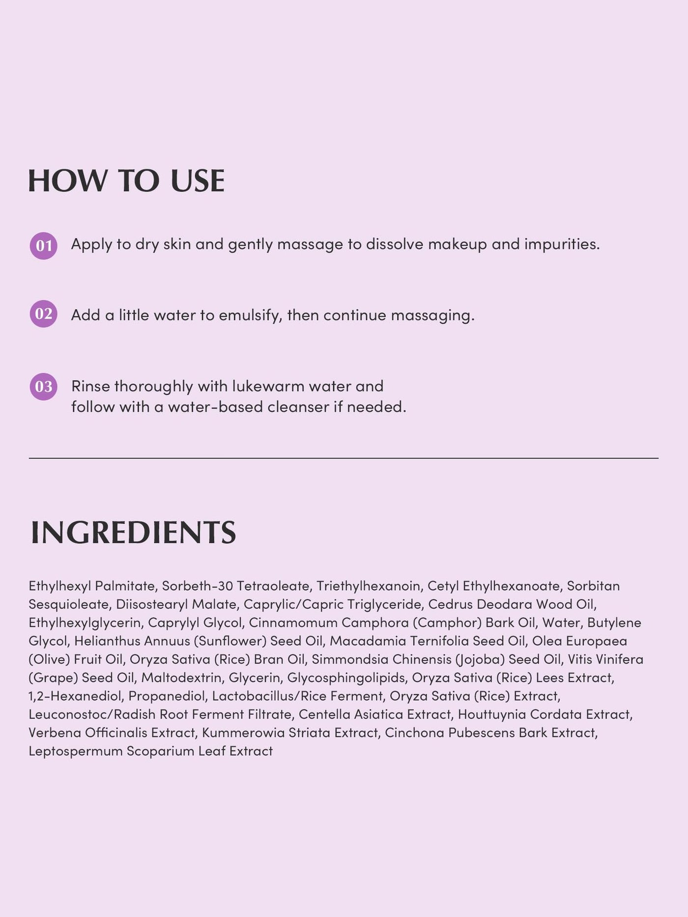 Ethylhexyl Palmitate, Sorbeth-30 Tetraoleate, Triethylhexanoin, Cetyl Ethylhexanoate, Sorbitan Sesquioleate, Diisostearyl Malate, Caprylic/Capric Triglyceride, Cedrus Deodara Wood Oil, Ethylhexylglycerin, Caprylyl Glycol, Cinnamomum Camphora (Camphor) Bark Oil, Water, Helianthus Annuus (Sunflower) Seed Oil, Macadamia Ternifolia Seed Oil, Olea Europaea (Olive) Fruit Oil, Oryza Sativa (Rice) Bran Oil, Simmondsia Chinensis (Jojoba) Seed Oil, Vitis Vinifera (Grape) Seed Oil, Maltodextrin, Glycerin, Glycosphingolipids, Oryza Sativa (Rice) Lees Extract, 1,2-Hexanediol, Propanediol, Lactobacillus/Rice Ferment, Oryza Sativa (Rice) Extract, Leuconostoc/Radish Root Ferment Filtrate, Centella Asiatica Extract, Houttuynia Cordata Extract, Verbena Officinalis Extract, Kummerowia Striata Extract, Cinchona Pubescens Bark Extract, Leptospermum Scoparium Leaf Extract.