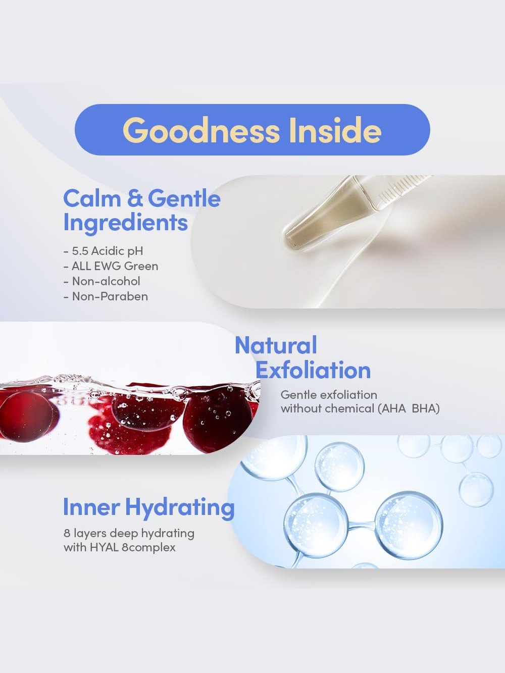Water, Glycerin, Propanediol, 1,2-Hexanediol, Protease, Betaine, Panthenol, Xanthan Gum, Allantoin, Euterpe Oleracea Fruit Extract, Sodium Hyaluronate, Beta-Glucan, Rubus Fruticosus (Blackberry) Fruit, Vaccinium Macrocarpon (Cranberry) Fruit, Vaccinium Angustifolium (Blueberry) Fruit, Rubus Idaeus (Raspberry) Fruit Extract, Sambucus Nigra Fruit Extract, Pentylene, Fructan, Styrene/VP Copolymer.