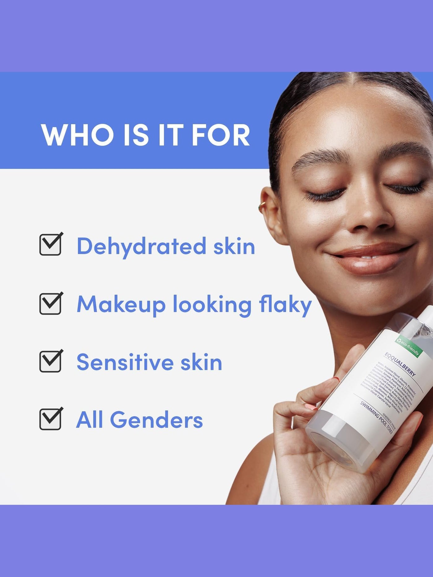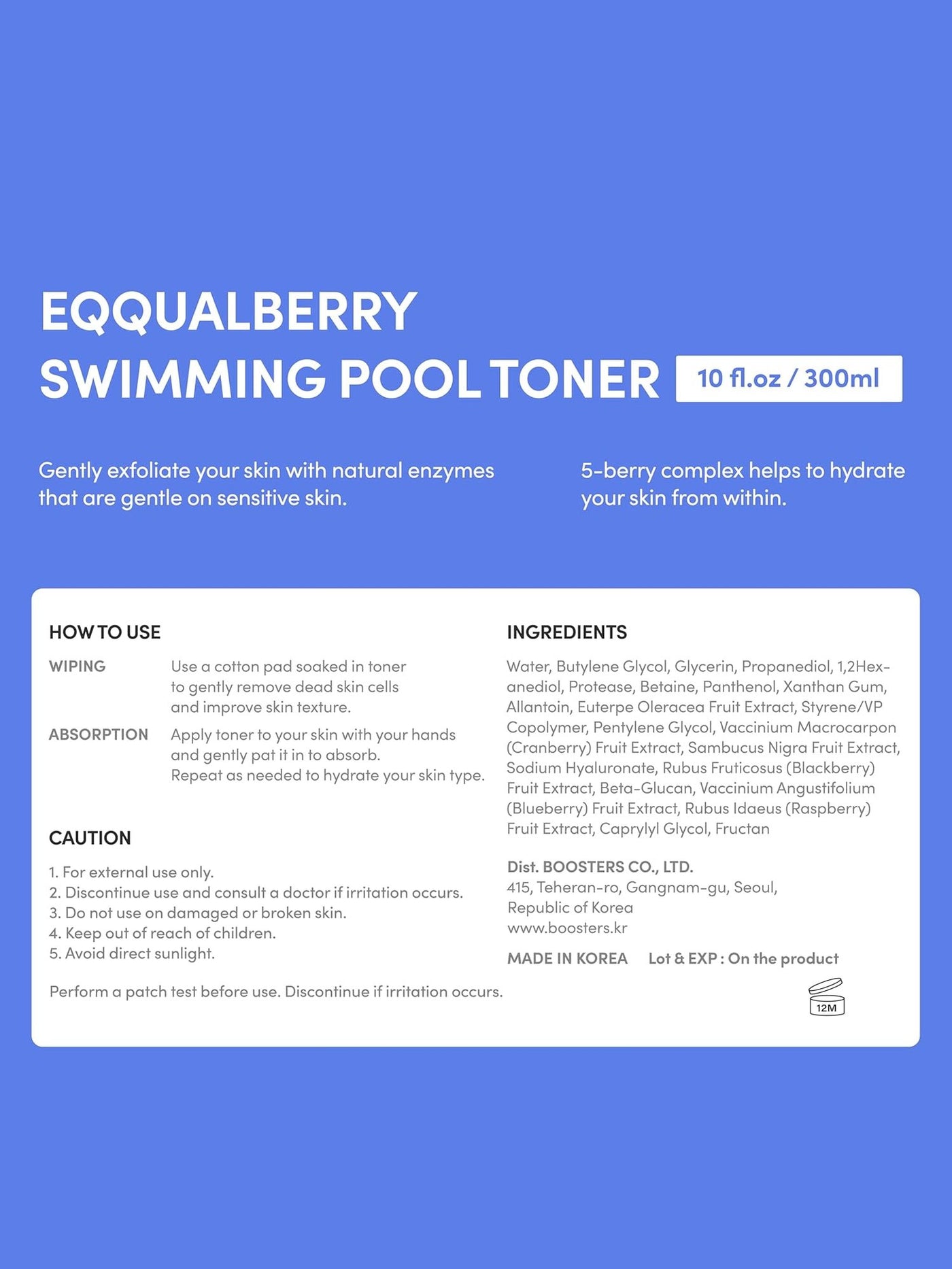 The Eqqualberry Swimming Pool Toner is a daily facial toner that dives deep into the skin for lasting moisture, while gently exfoliating away dead skin cells and unclogging pores. Enriched with 5 Berry Complex with anti-ageing properties to deliver antioxidant and nourishing properties, while naturally-derived Protease enzymes gently exfoliate skin, minimising pores and removing dead skin cells, leaving your complexion clearer and more refined.