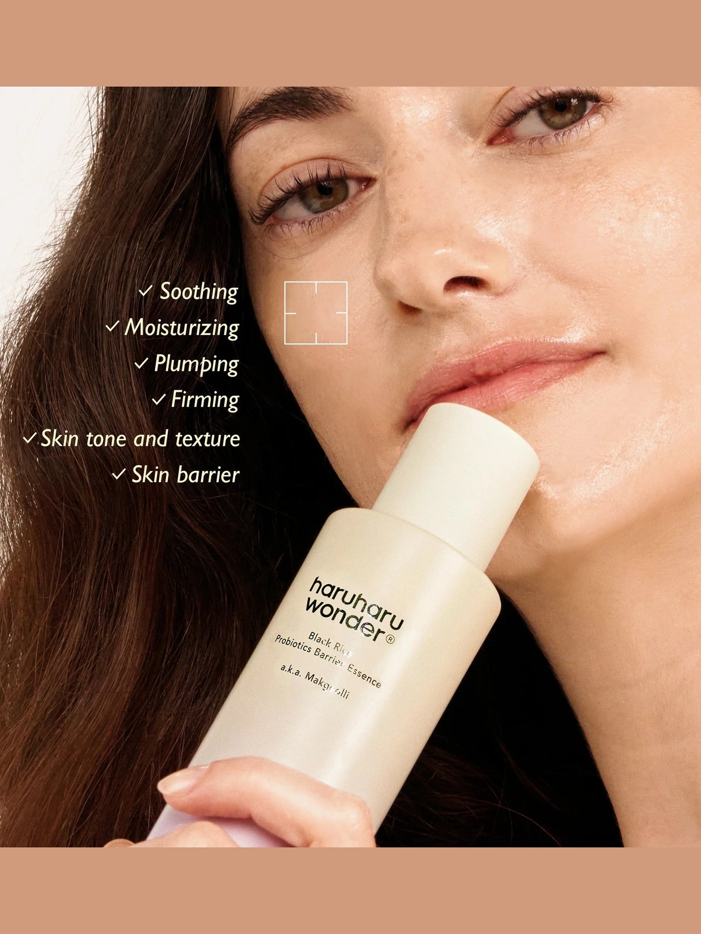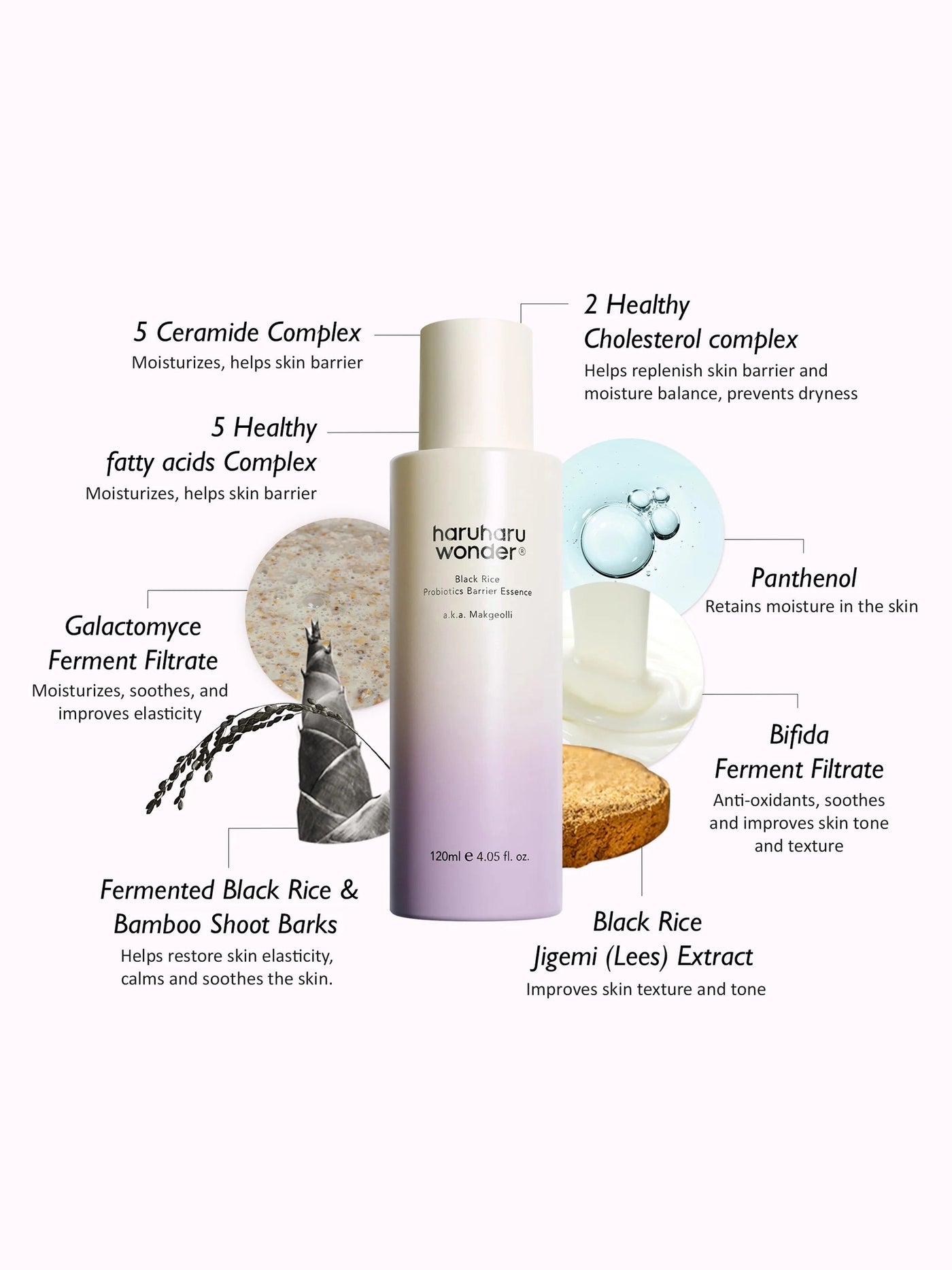 The HARUHARU WONDER Black Rice Probiotics Barrier Essence is a creamy, dreamy, milky essence to replenish skin barrier, promoting a hydrated and smooth complexion. Formulated with 5 Ceramide Complex and 5 Fatty Acids Complex to boost barrier strength, as well as Phytosterol and Cholesterol to firm and hydrate skin. This lightweight formula also includes Galactomyces Ferment Filtrate to boost skin elasticity, as well as antioxidant-rich Black Rice Lees Extract to soothe and strengthen skin.