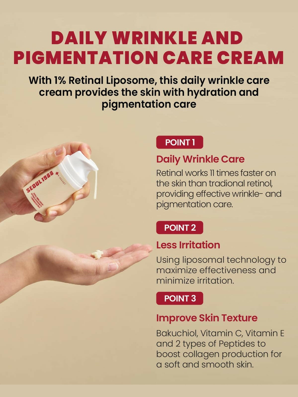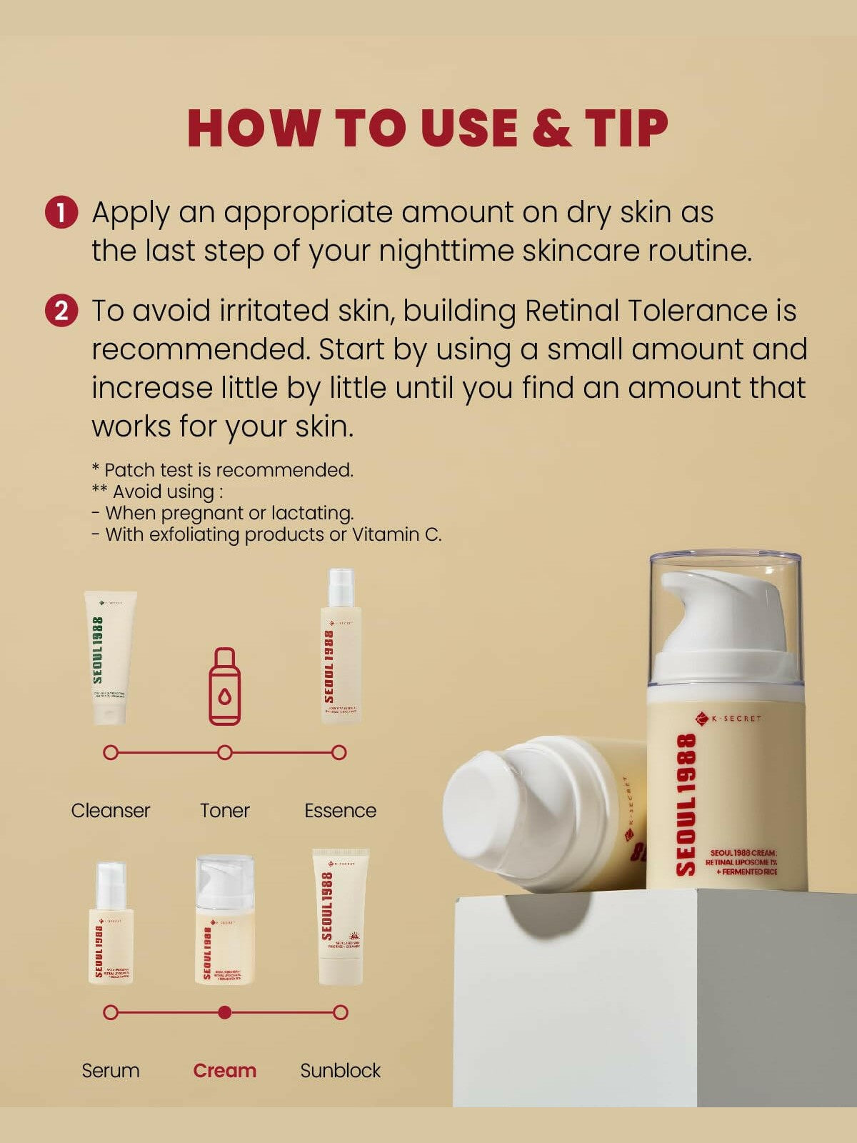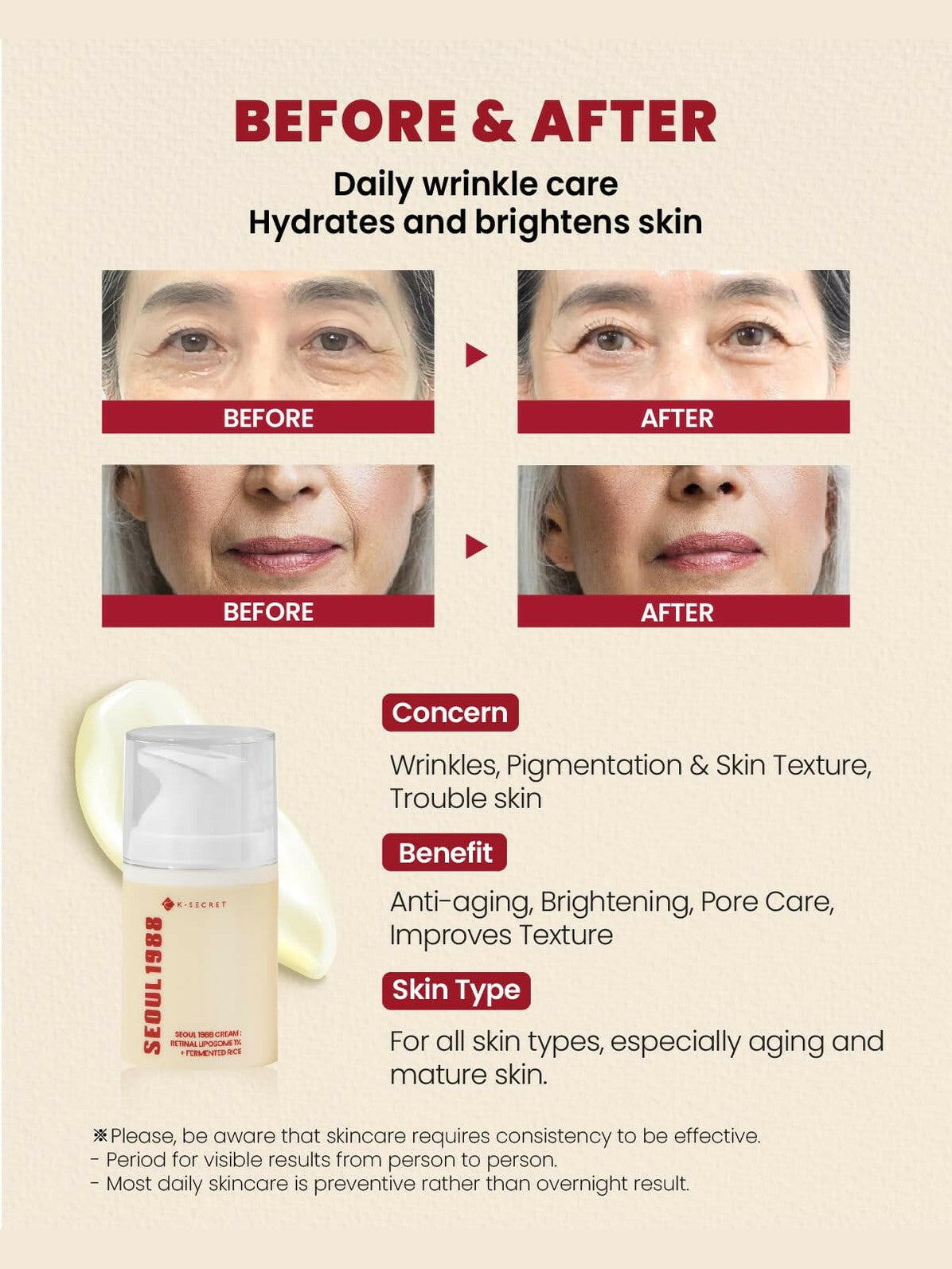 KSecrets SEOUL 1988 Cream : Retinal Liposome 1% + Fermented Rice is a unique composition of Retinal liposome and fermented rice. It is formulated to provide daily wrinkle and pigmentation care for skin. Some benefits are as follows:
