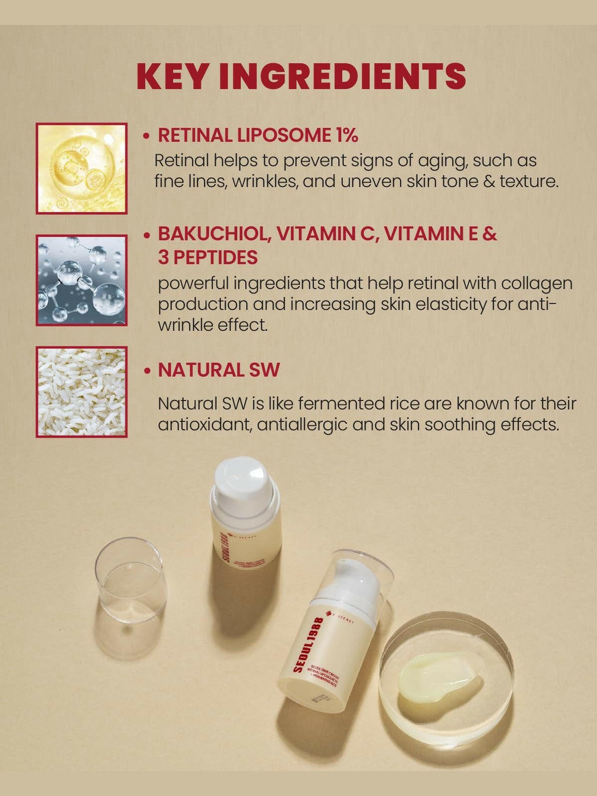 Water, Cetyl Ethylhexanoate, Glycerin, 1,2-Hexanediol, Niacinamide, Propanediol, Ammonium Acryloyldimethyltaurate/VP Copolymer, Carbomer, Tromethamine, Sodium Acrylate/Sodium Acryloyldimethyl Taurate Copolymer, Polyisobutene, Caprylic/Capric Triglyceride, Lactobacillus/Panax Ginseng Root Ferment Filtrate, Lactobacillus/Rice Ferment(1,000 ppm), Lactobacillus/ Soybean Ferment Extract, Macadamia Ternifolia Seed Oil, Saccharomyces/Coix Lacryma-Jobi Ma-yuen Seed Ferment Filtrate, Saccharomyces/Potato Extract Ferment Filtrate, Xanthan Gum, Hydrogenated Lecithin, Disodium EDTA, Ethylhexylglycerin, Allantoin, Caprylyl Glycol, Adenosine, Glyceryl Acrylate/Acrylic Acid Copolymer, Caprylyl/Capryl Glucoside, Cholesterol, Polyglyceryl-10 Oleate, Sorbitan Oleate, Brassica Campestris (Rapeseed) Sterols, Phytosteryl/Behenyl/Octyldodecyl Lauroyl Glutamate, Retinal(100 ppm), Silica, Aluminum/Magnesium Hydroxide Stearate, Tocopherol, Potassium Cetyl Phosphate, Pentaerythrityl Tetra-di-t-butyl Hydroxyhydrocinnamate, Arctium Lappa Root Extract, Cnidium Officinale Root Extract, Dioscorea Japonica Root Extract, Paeonia Suffruticosa Root Extract, Rehmannia Chinensis Root Extract, 3-0-Ethyl Ascorbic Acid, Bakuchiol, sh-Oligopeptide-1, sh-Oligopeptide-2, sh-Polypeptide-1.