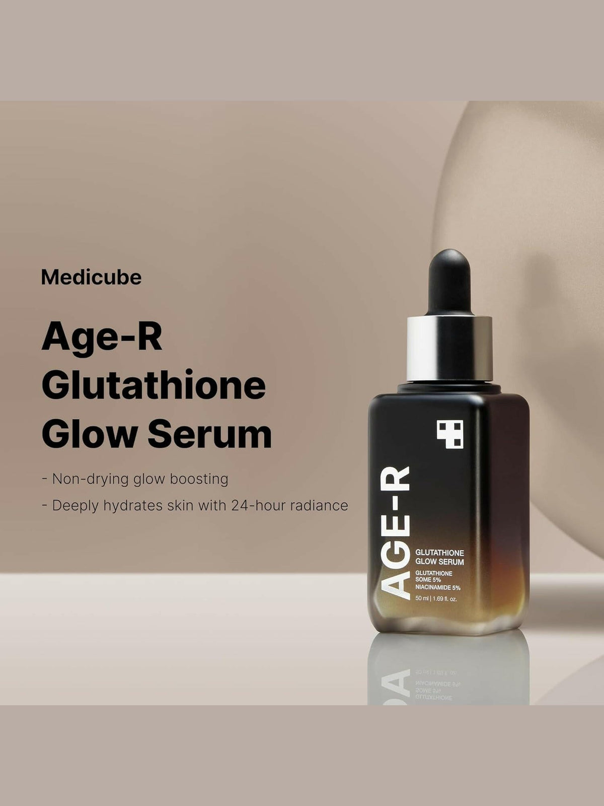 Medicube AGE-R Glutathione Glow Serum features active Glow-zom Technology with Glutathione (50,000ppm), Niacinamide, Adenosine, Patented Skin-like Collagen, and Bifida Fermentation Lysate. This potent combination enhances the skin's natural glow, addressing blemishes, spots, and pigmentation. This serum helps in fading blemishes, spots, and pigmentation while filling your skin with radiance. It is designed to visibly lift crow's feet, smile lines, and forehead wrinkles, leaving your skin looking voluminous and youthful.