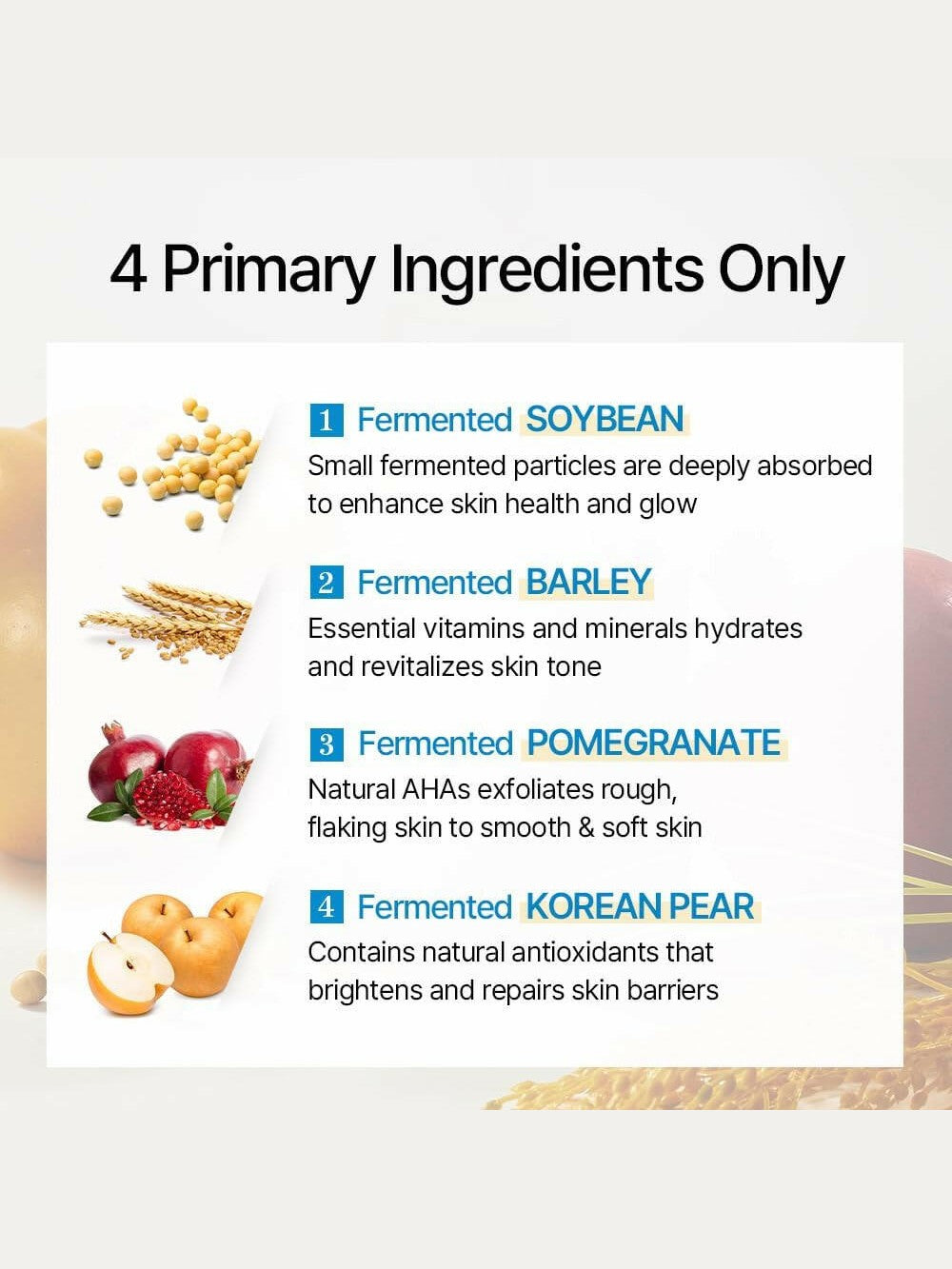 Lactobacillus/Soybean Ferment Extract, Lactobacillus/Punica Granatum Fruit Ferment Extract, Saccharomyces/Barley Seed Ferment Filtrate, Lactobacillus/Pear Juice Ferment Filtrate