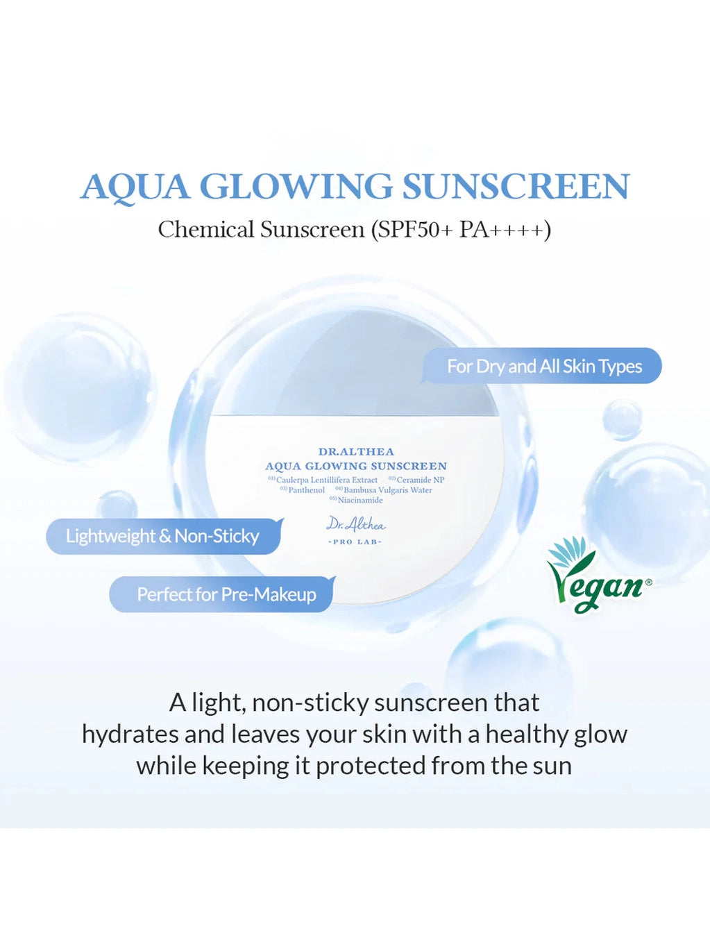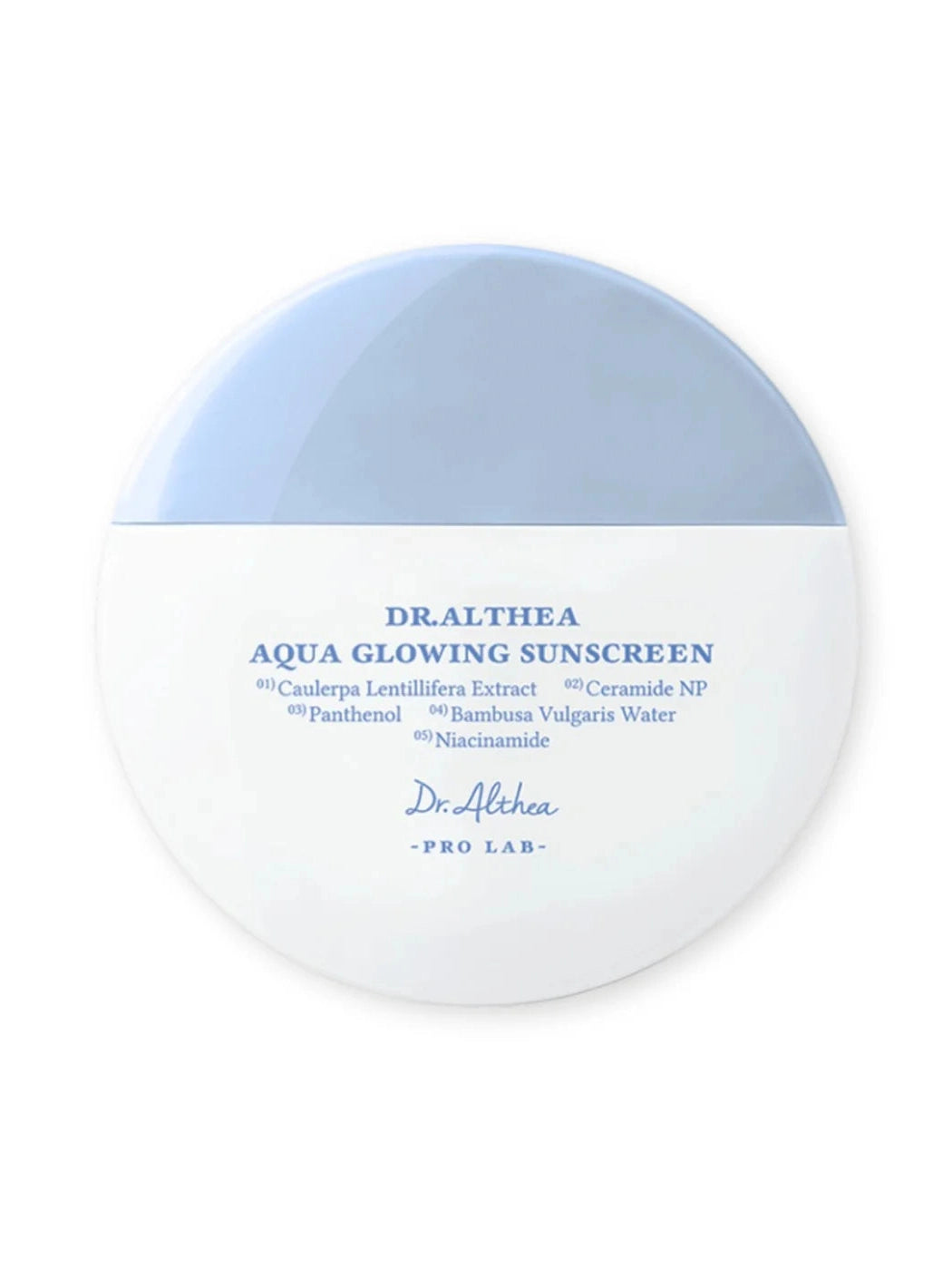 Meet Dr. Althea Aqua Glowing Sunscreen the dr althea aqua glowing sunscreen made for a fresh, dewy complexion. This lightweight chemical formula floods skin with hydration using a base of Bamboo Water and Green Caviar (Caulerpa Lentillifera). Panthenol helps comfort skin, while Niacinamide, Ceramide NP and Sodium Hyaluronate support a smooth, supple look.