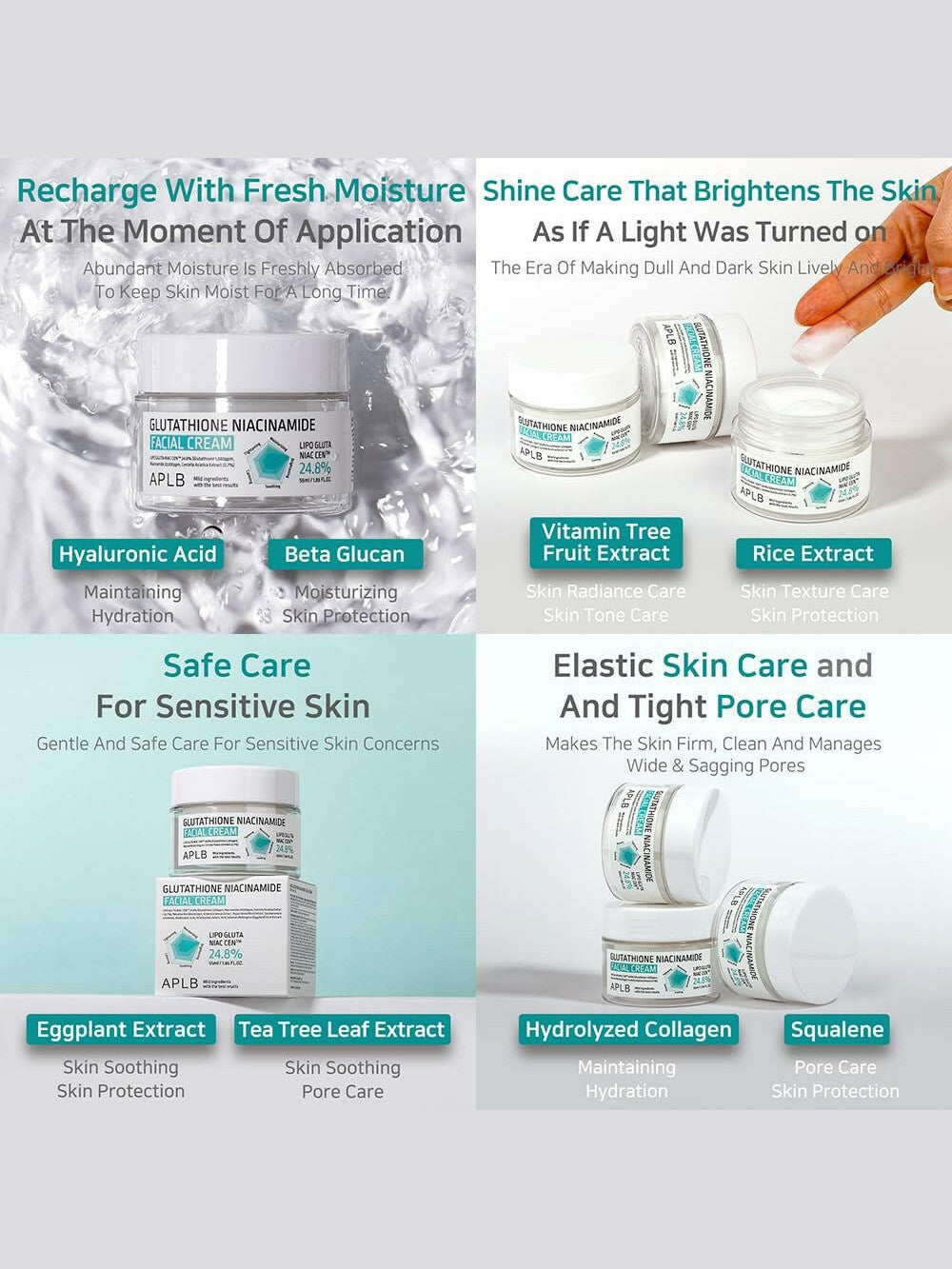 APLB Glutathione Niacinamide Facial Cream is your answer to glowing and hydrated skin! The two powerhouse ingredients, Glutathione and Niacinamide, work together to deliver skin brightening and anti-ageing benefits while providing deep hydration. This moisturiser helps in reducing the dark spots, evening out skin tone, helping you to achieve a radiant and healthy glow. The texture is very lightweight, helping it to absorb into the skin quickly. It is suitable for all skin types and can be used in your AM or PM routine. For even better results, pair it up with APLB Glutathione Niacinamide Ampoule Serum.